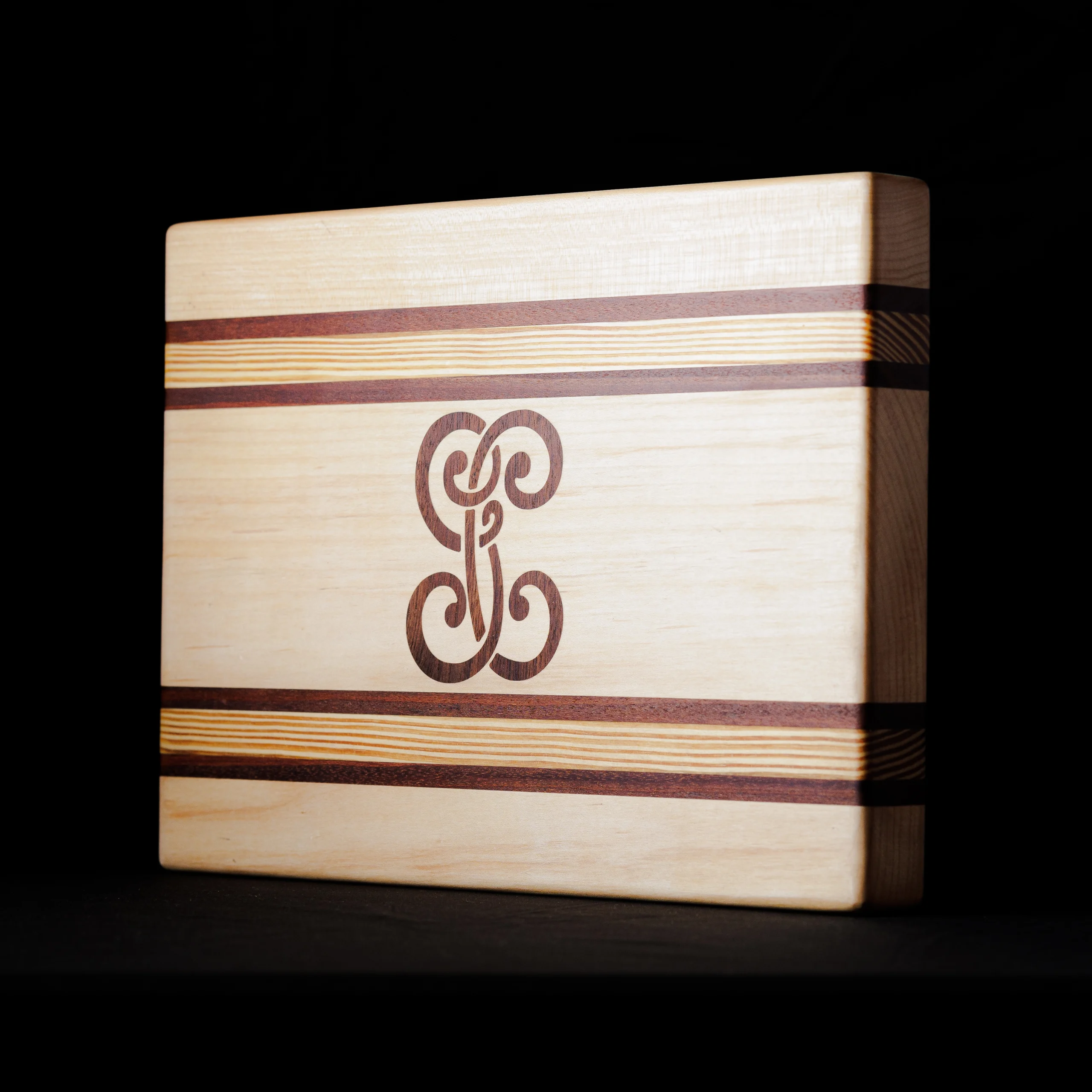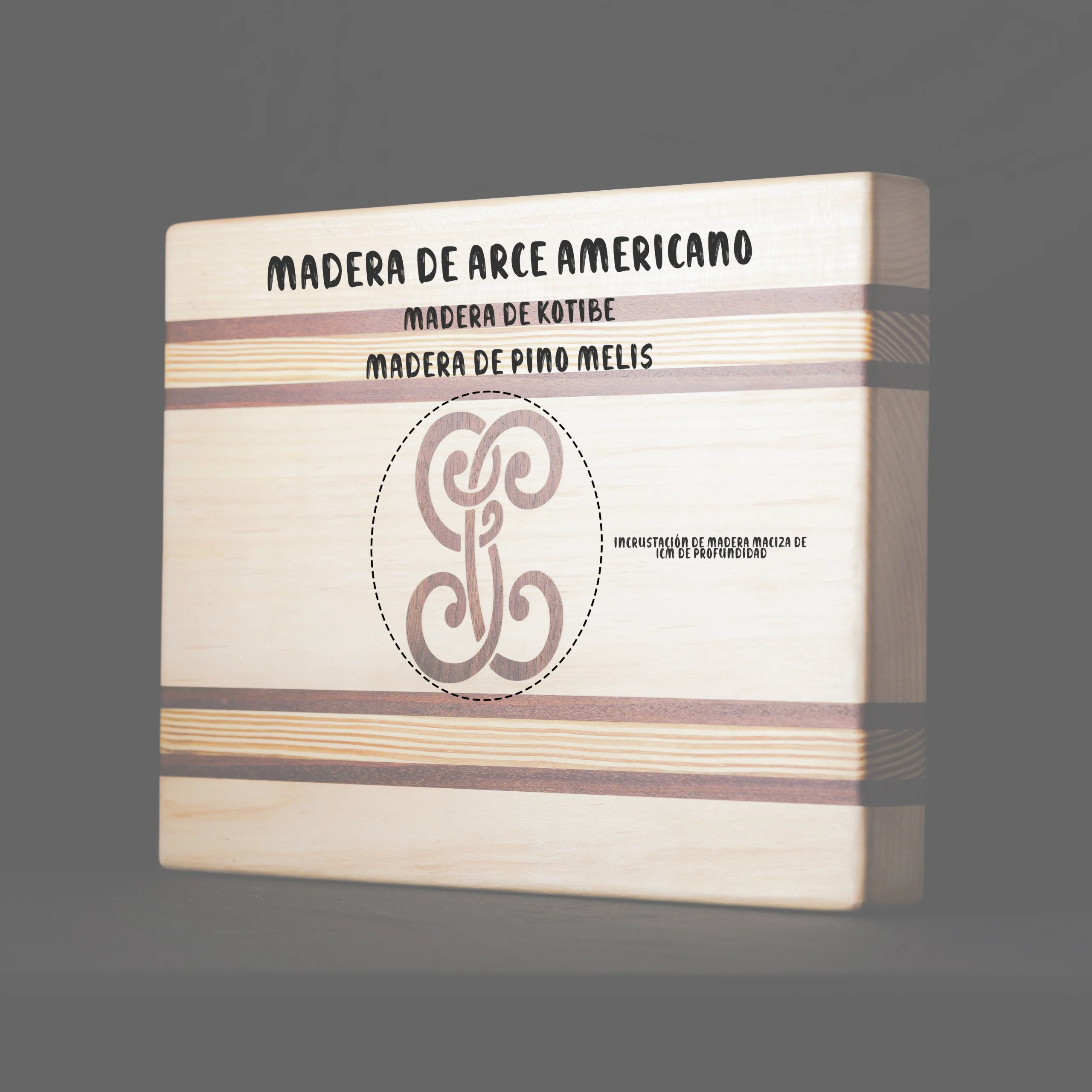 La Tabla de Corte Alhambra, una pieza única que une el diseño más sofisticado con la funcionalidad práctica. Confeccionada con una selección de tres maderas macizas de alta calidad (Arce Americano, Pino Melis y Kotibe), esta tabla está diseñada para resistir desde las tareas diarias de cocina hasta las cenas más exigentes y elegantes.