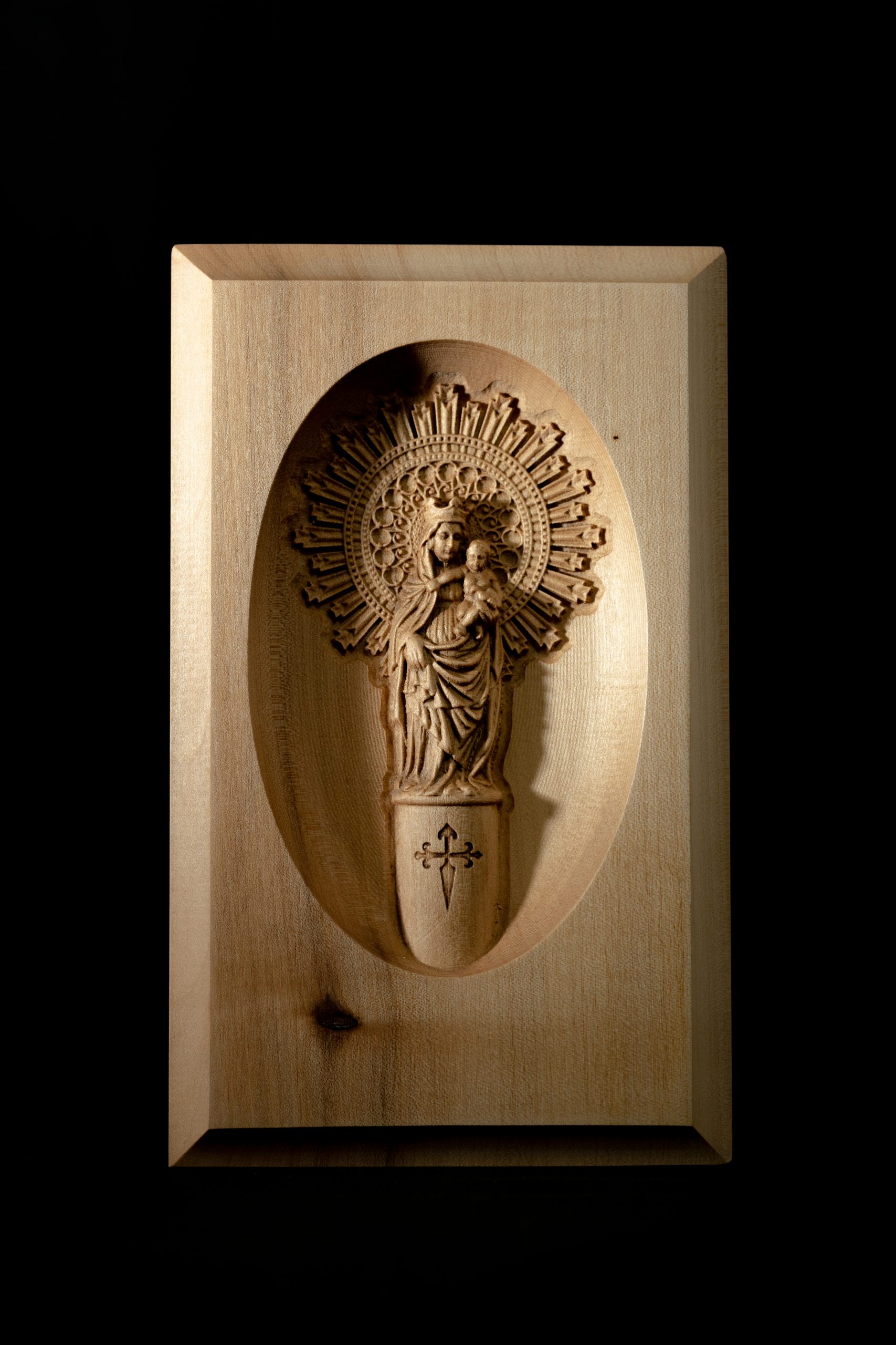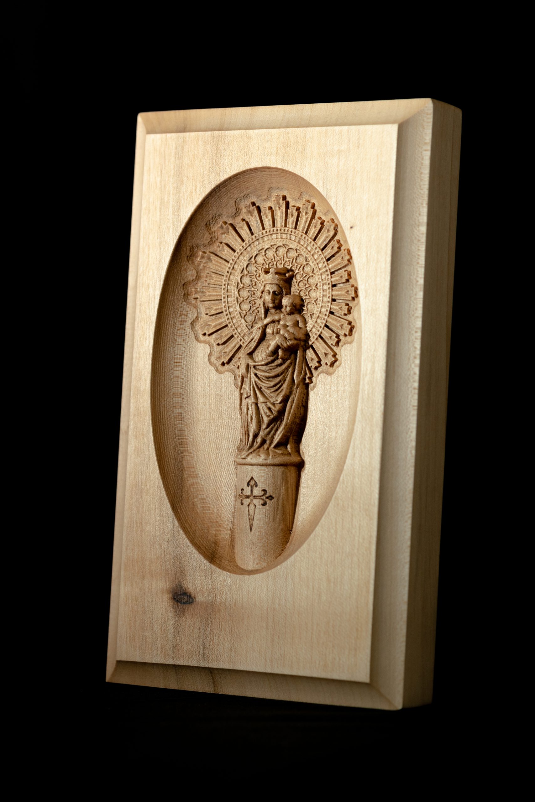 Esta talla en medio relieve de la Virgen del Pilar, elaborada con madera maciza de arce americano, es una pieza única que combina tradición y elegancia. Con un acabado detallado que resalta cada pliegue y rasgo de la figura, esta obra captura la esencia espiritual y cultural de uno de los símbolos más venerados en el mundo cristiano.